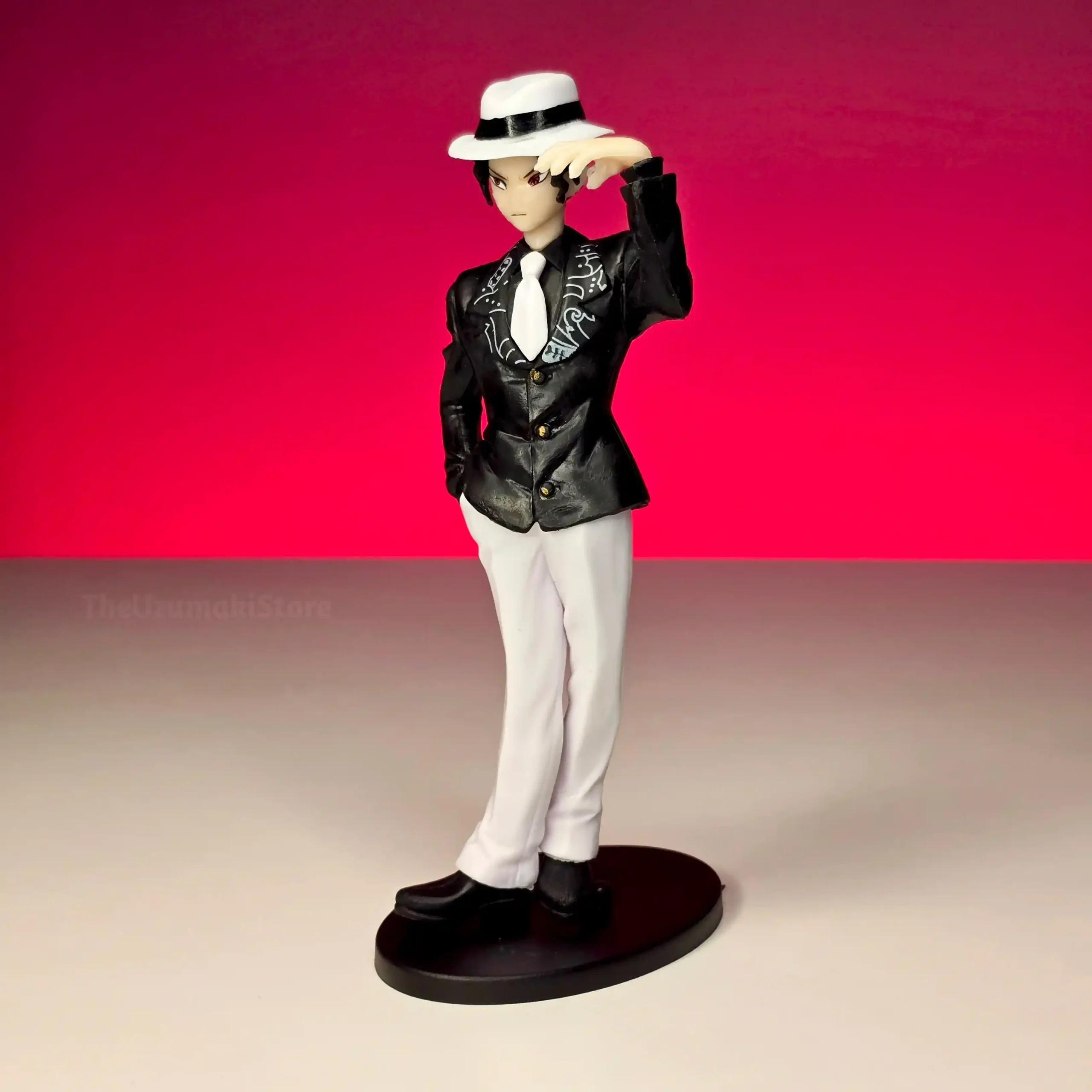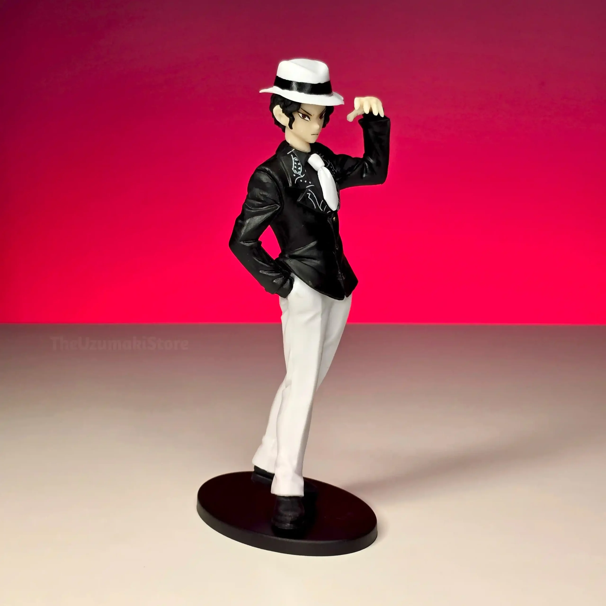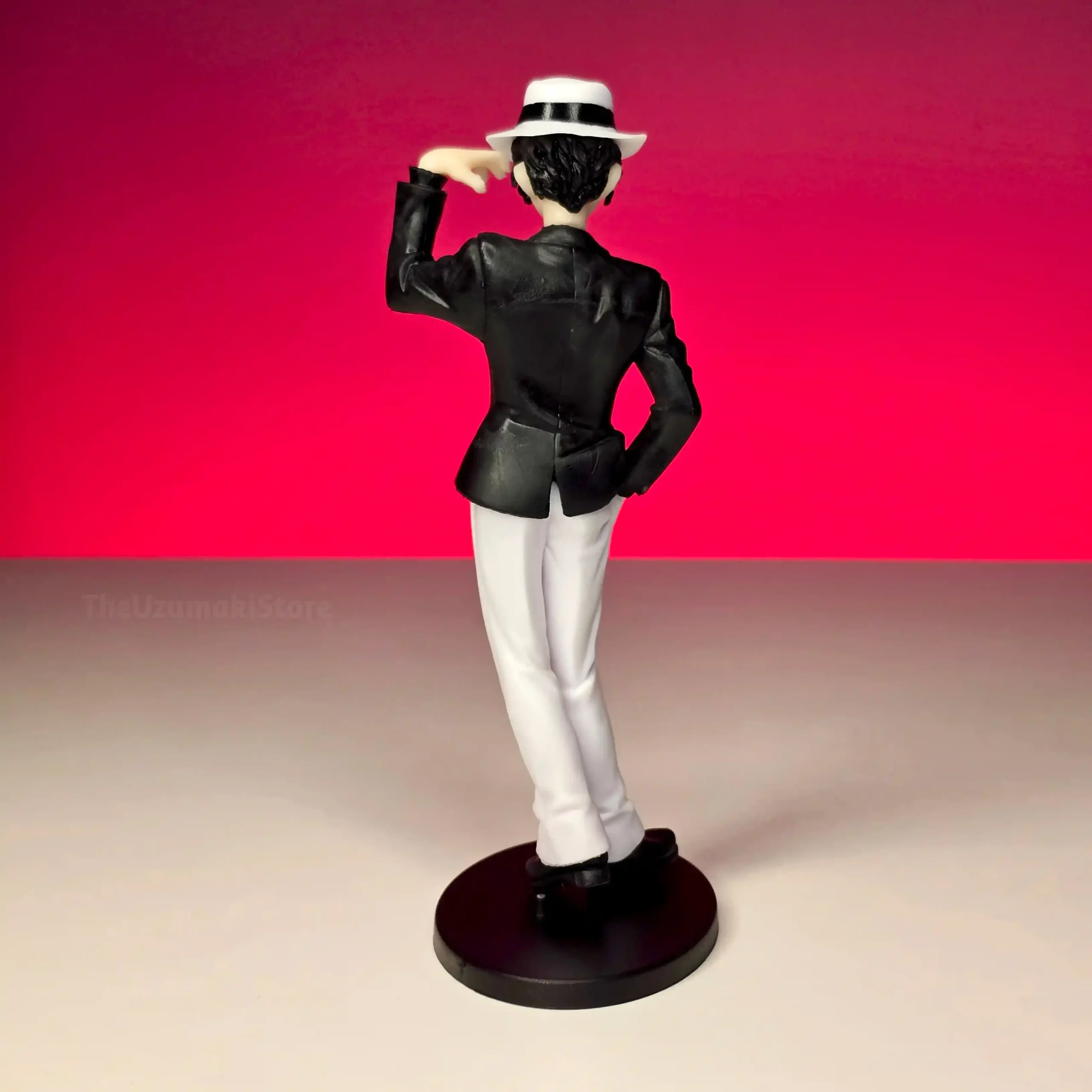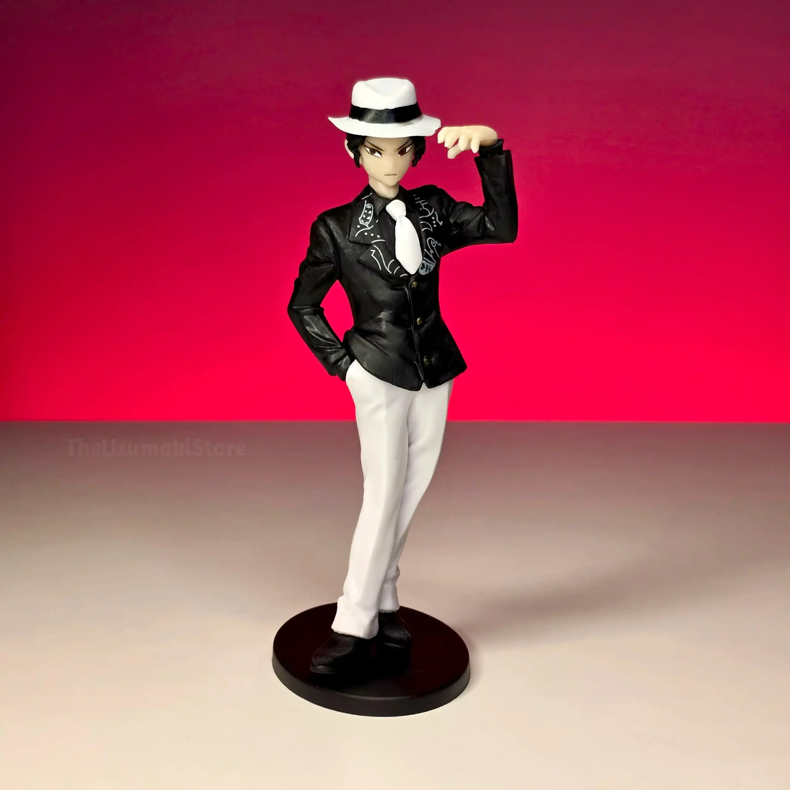 | Design | Iconic black suit and white fedora hat look |